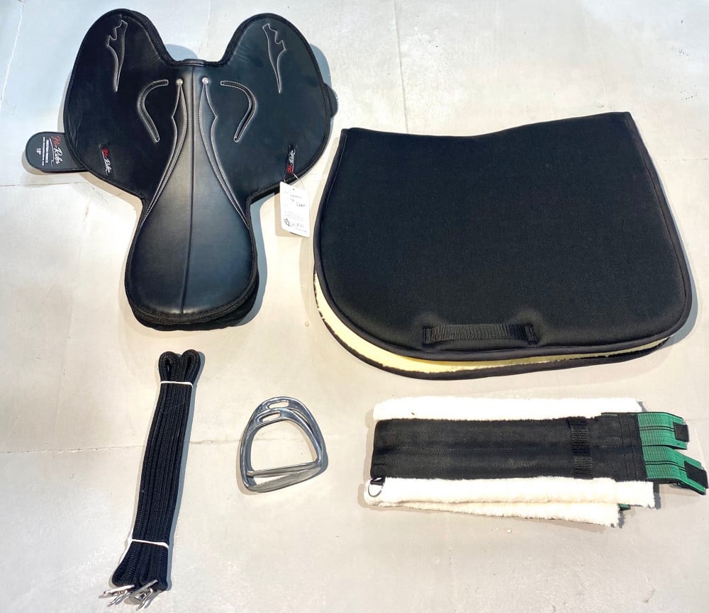 1- سرج تشغيل هاي رايدر مقاس 18 يمتاز بخفة الوزن2- لبادة فرو3- حزام بطن فرو4- سير ركابات دبل5- ركابات حديد وزن خفيف